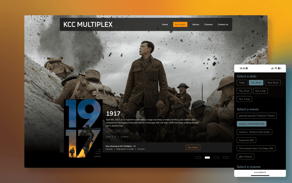 Redesigned the KCC Multiplex ticket booking system to allow easy selection of dates, movies, and theatre locations. The new design creates a more intuitive and visually appealing experience for users. It offers a cinematic journey that starts long before the theater doors open. Visit www.kccmultiplex.lk