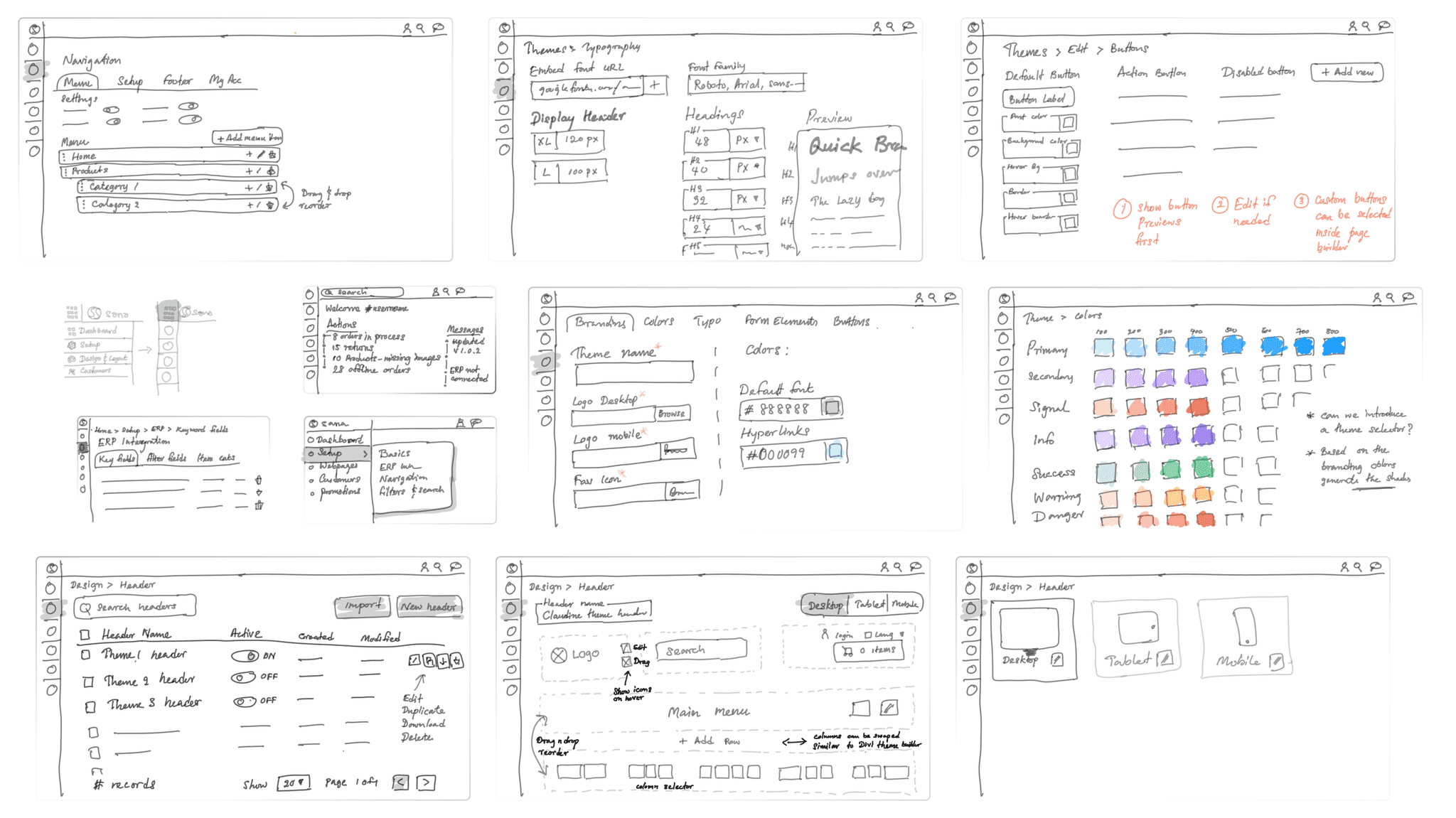 Lo-fi prototypes exploring navigation structure and theme customization flows