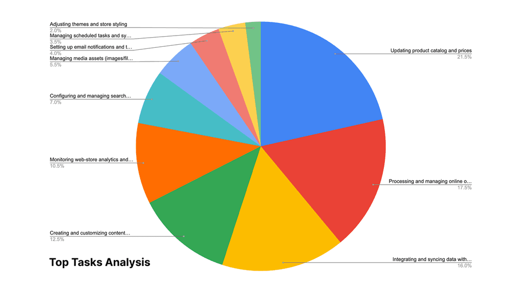 Through user interviews and product analytics, we identified stories that highlighted key pain points. Users struggled with the admin interface, information architecture, order management, and when creating or updating content pages.