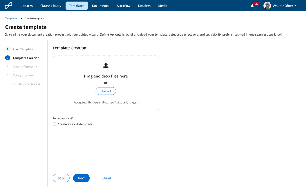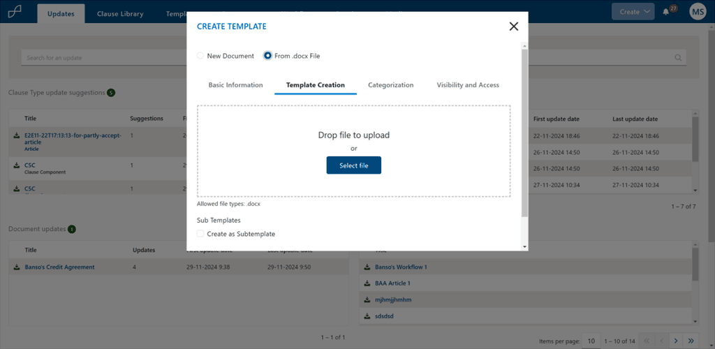Template Creation – Drag-and-drop or upload .docx, PDF, or text files; optionally flag the upload as a sub-template