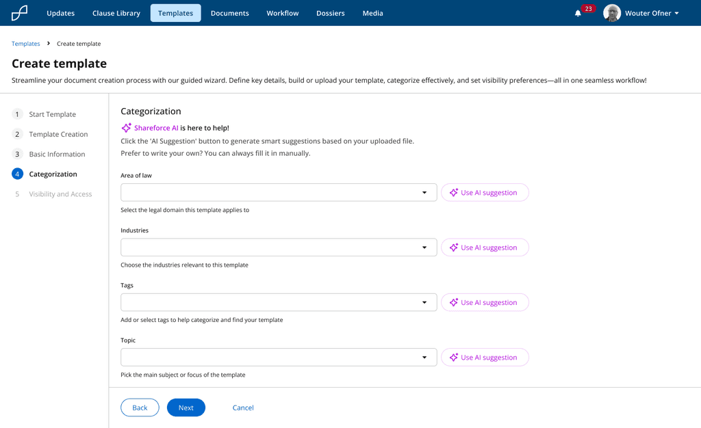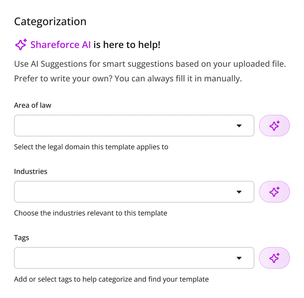 Categorization – Define area of law, industry, tags, and topic, with AI assistance to ensure consistent metadata