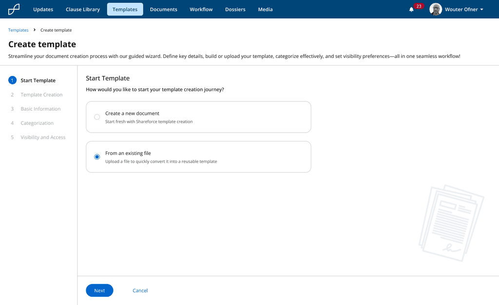 Start Template – Choose whether to begin from a blank document or convert an existing file into a reusable template